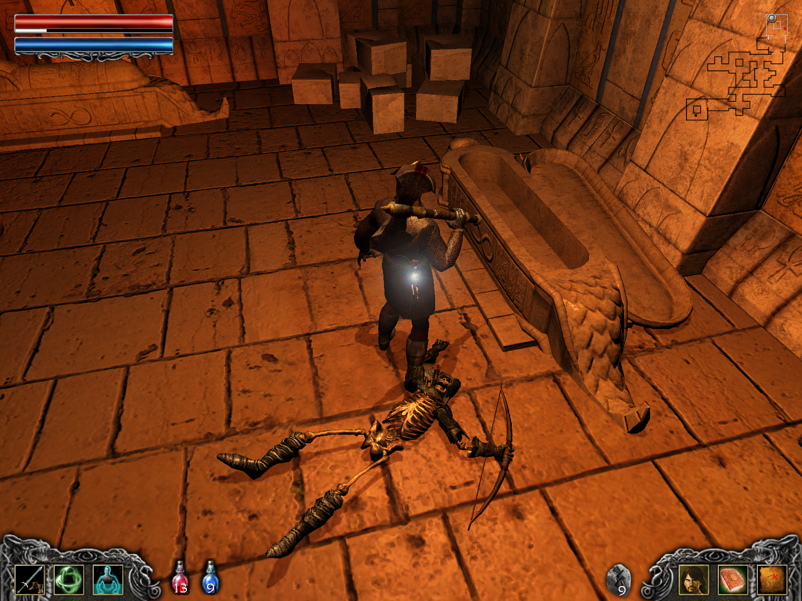 A l’instar de Titan Quest, la caméra est placée de trois quart en vue de haut. Mais à la différence de ce dernier, c’est qu’il est possible de tourner autour de votre personnage et de zoomer même. Vous pourrez ainsi déplacer la caméra, même si le champ de vision est trop faible. La nuit et le jour sont gérés dans le jeu mais n’ont aucune utilité, tout comme, à certains endroits, la gestion du climat (neige dans les montagnes, pluies dans les jungles). Cela donne encore un peu plus de cachet au jeu. L’interface est entièrement paramétrable. En effet, les trois icônes en bas à gauche correspondent aux trois boutons de la souris et peuvent être entièrement reconfigurés comme vous le souhaitez. De plus, pour toutes les compétences, il est possible de leur donner une touche de raccourci. C’est très plaisant.